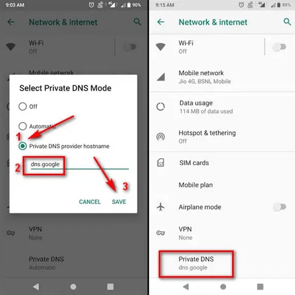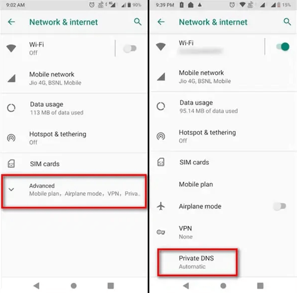 اندروید ۹ و جدیدتر تنها از نسخه جدید DNS یعنی DNS-over-TLS پشتیبانی میکند و به همین دلیل ممکن است با برخی از سرورهای DNS سازگار نباشد. پیش از این که آدرس DNS را در این نسخههای اندروید تنظیم کنید، مطمئن شوید که ارائه دهنده سرویس DNS مورد نظرتان، DNS-over-TLS را ارائه میکند. همچنین به یاد داشته باشید که این تنظیمات، تاثیری روی استفاده از ابزارهای تغییر آیپی ندارد و این ابزارها معمولا تنظیمات DNS در اندروید را نادیده میگیرند. برای تغییر DNS در اندروید ۹ یا جدیدتر به روش زیر عمل کنید: