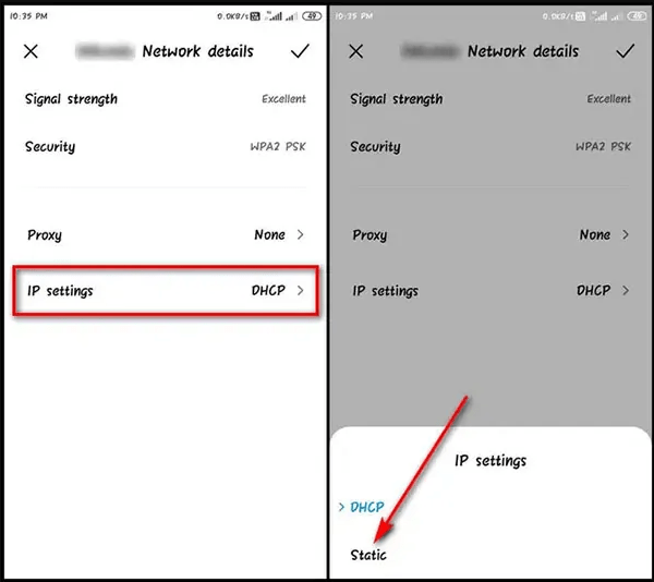۳. در این منو به دنبال گزینهای به نام IP Settings بگردید. احتمالا در جلوی نام این گزینه، عبارت DHCP به چشم میخورد. این گزینه را به Static تغییر دهید تا امکان تنظیم دستی DNS را داشته باشید.