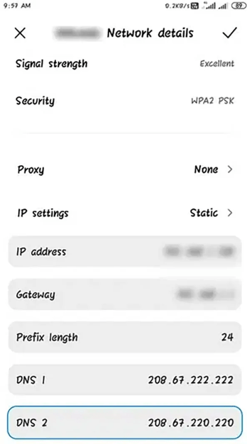 ۴. حالا باید علاوه بر وارد کردن آدرس DNS مثلا ۴٫۲٫۲٫۴ و ۹٫۹٫۹٫۹، آدرس آیپی و گیتوی روتر وایفای خود را نیز به طور دستی وارد کنید.
